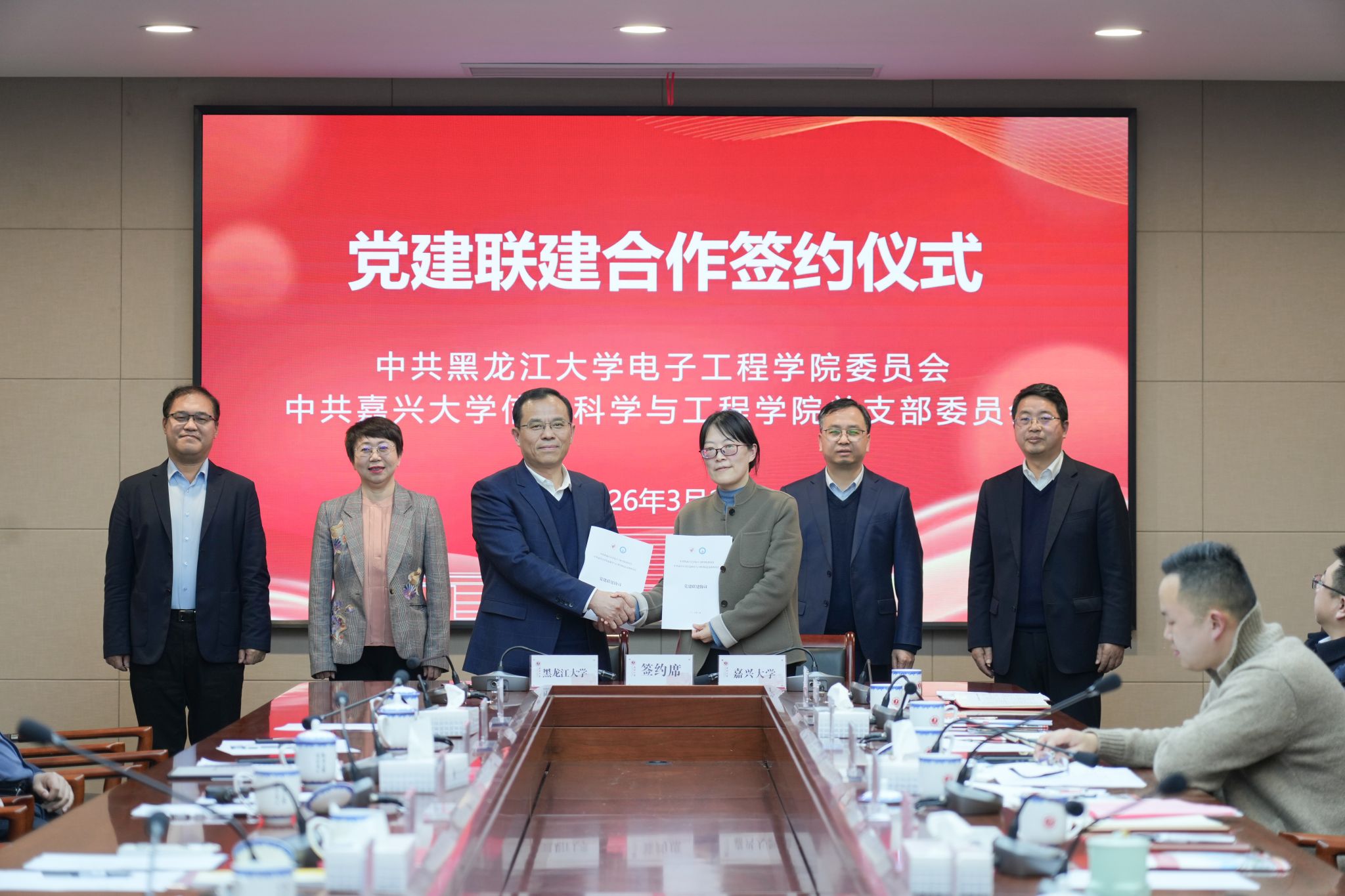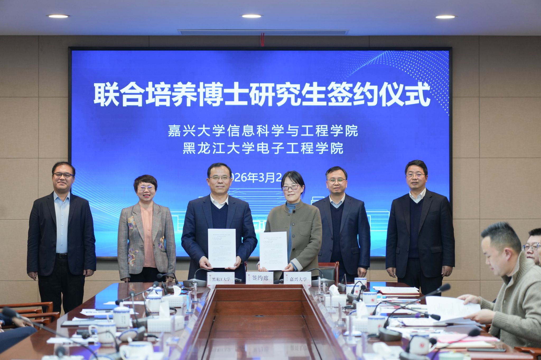 与黑龙江大学电子工程学院合作签约仪式在嘉兴大学行政楼346会议室举行。双方围绕党建联建、科研协同、人才培养等领域达成战略合作共识,并在双方校领导见证下正式签署合作协议。